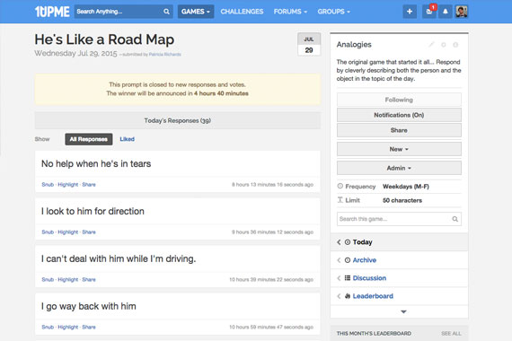 OneUpMe.com is a wordplay site that fosters abstract and creative thought. The site hosts a variety of games and every day there's new prompt for users to respond to, attempting to 'one-up' each other in the cleverness of their response. But perhaps more importantly, the site is a vibrant community of creative thinkers from around the world in various creative industries.